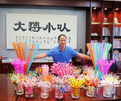 在雙童樣品間里,能看到各種造型的藝術吸管,供兩人共吸的情侶吸管、帶有風車的玩具吸管、能做成眼鏡框的藝術吸管、能測溫變色的多功能吸管,還有能幫助小孩子吃藥的功能吸管……據(jù)說這些吸管大多都是樓仲平創(chuàng)意、設計的。
