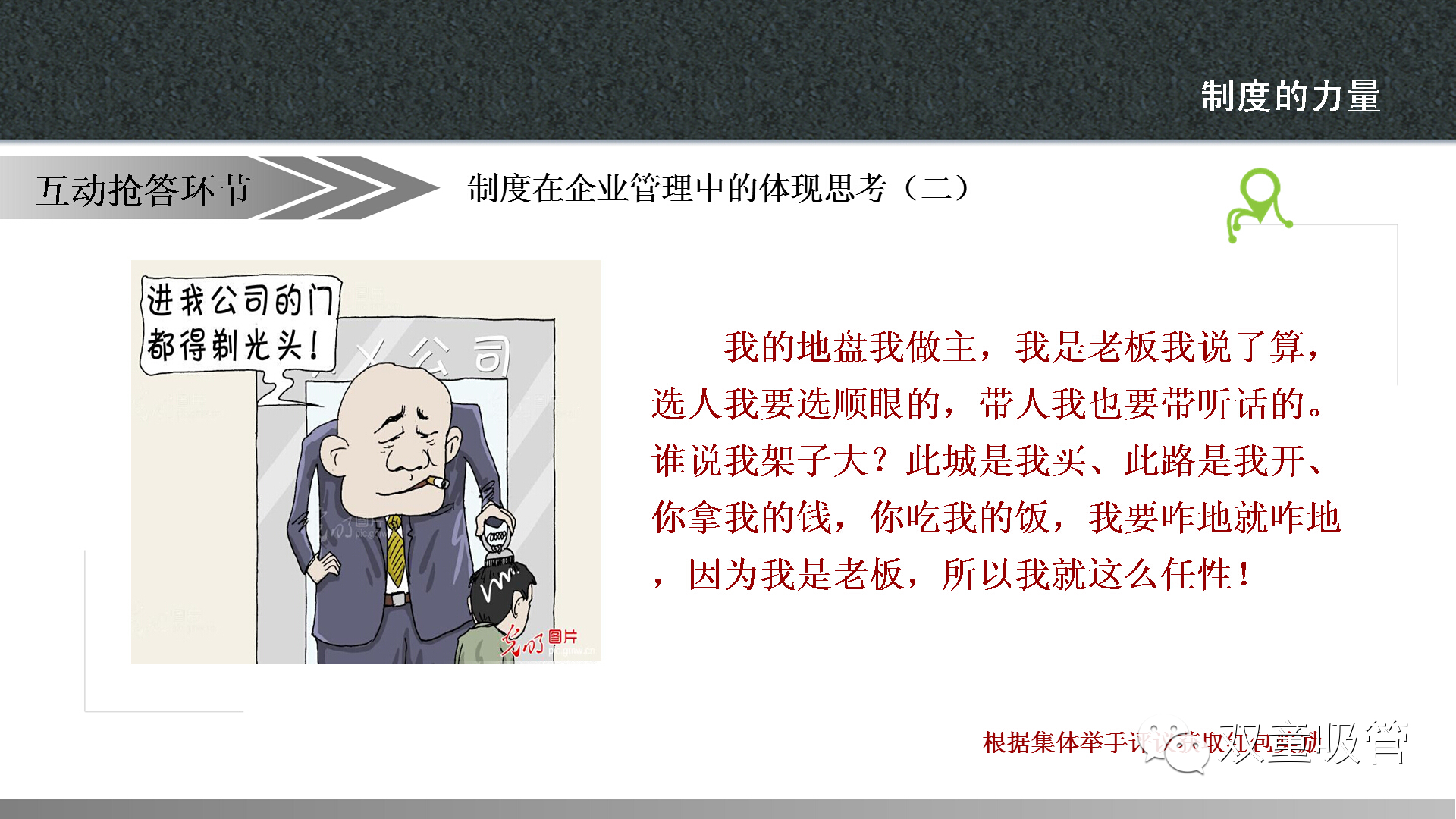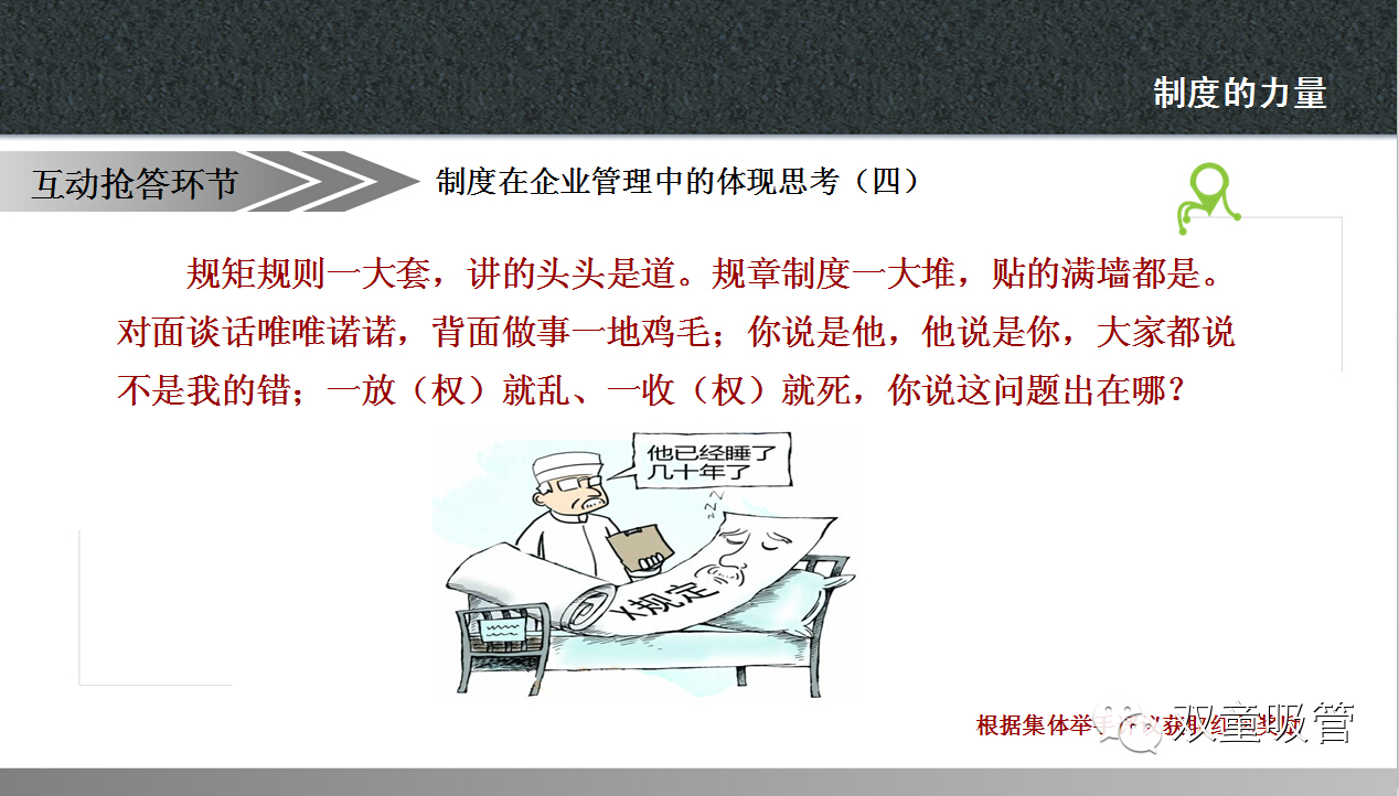 當(dāng)然啦,這樣的案例,當(dāng)家人準(zhǔn)備了許多,讓大家在快樂(lè)中學(xué)習(xí)到了制度的魅力。以前吸管妞總是有一種誤解,覺得制度就是上級(jí)用來(lái)管理下級(jí)的一種方式。通過(guò)昨天的課程終于讓妞明白了,原來(lái)制度不僅僅是有利于上級(jí)管理,更有利于雙方的權(quán)利得到保障,讓公司的流程化管理更加準(zhǔn)確高效!下面,吸管妞就把干貨放上來(lái),大家可要好好看哦!
