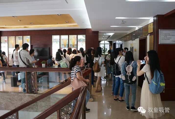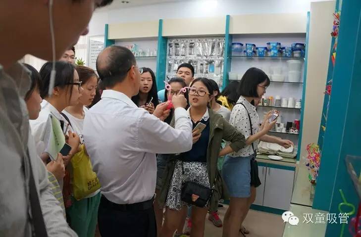 而當參觀隊伍匯總到樣品房時,當家人的“導游”講解更加賣力了: “這根吸管埋在土里三個月就能自行降解,因為它是玉米淀粉做的?!?“哇!” “這根吸管有二十多個零配件,有好幾項專利?!?“哇!” 在雙童吸管樣品房里,隨著當家人樓總對產(chǎn)品的介紹,浙師大的妹子們一起發(fā)出的贊嘆不絕于耳!