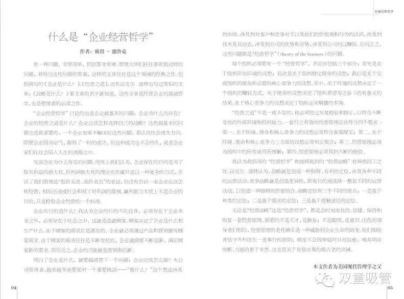 首先,《雙童經(jīng)營(yíng)哲學(xué)》的開(kāi)篇,就是美國(guó)現(xiàn)代管理學(xué)之父彼得德魯克所寫(xiě)的《什么是“企業(yè)經(jīng)營(yíng)哲學(xué)”》,通過(guò)他的講解闡述,使我們明白企業(yè)經(jīng)營(yíng)哲學(xué)的重要性。