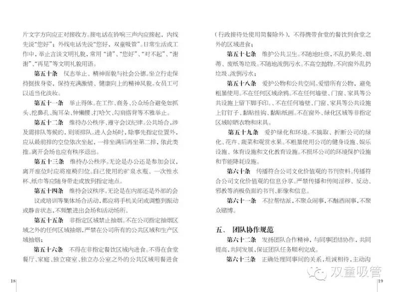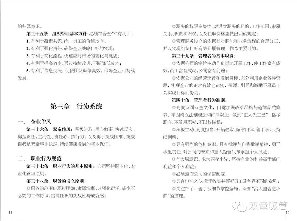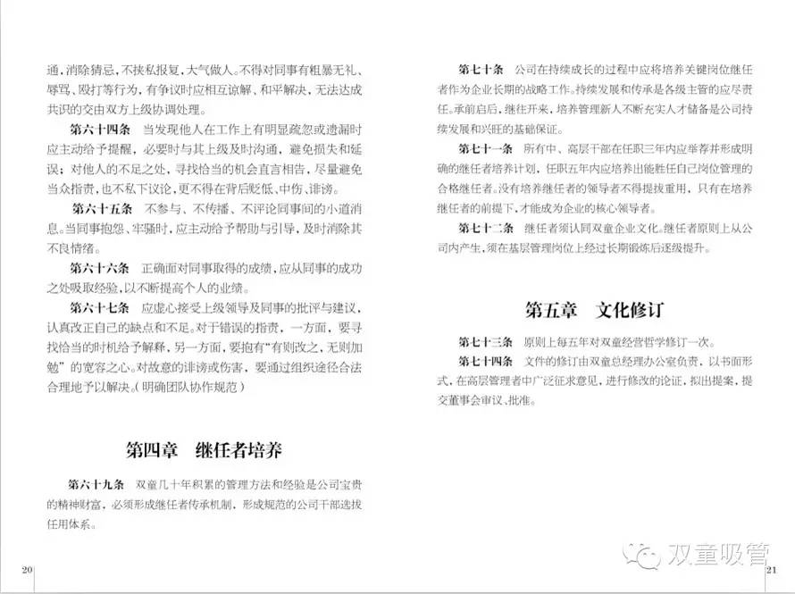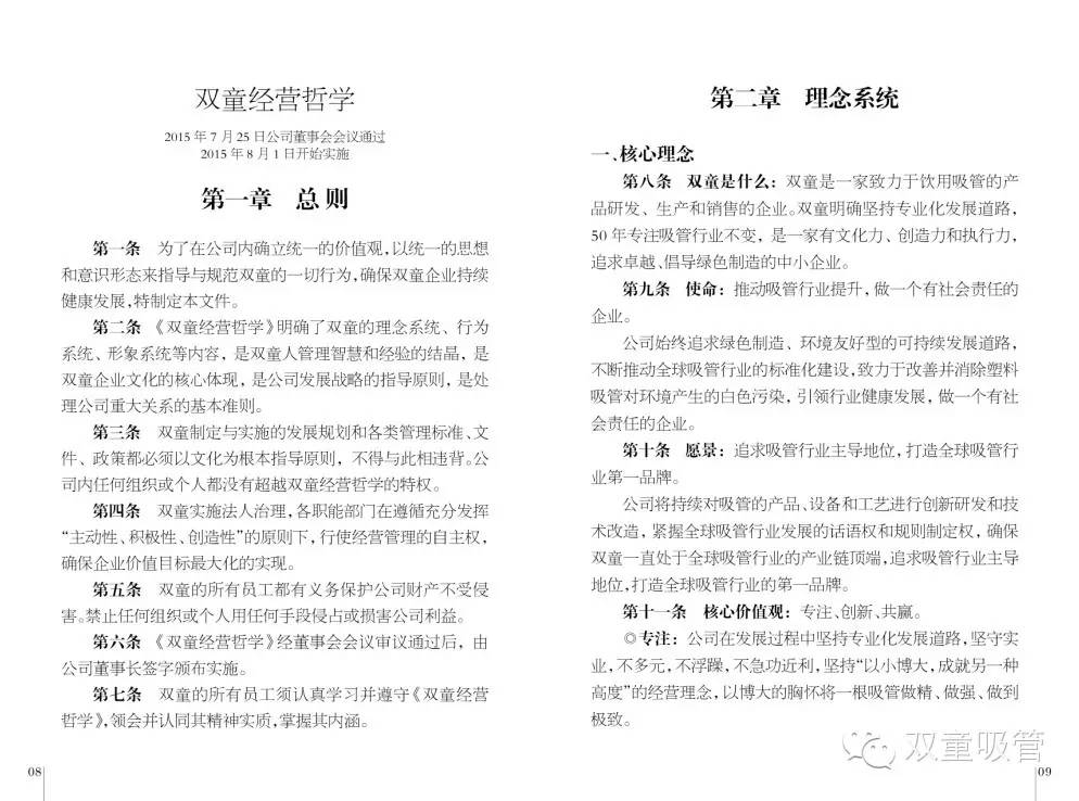 在《雙童經(jīng)營(yíng)哲學(xué)》中,共分為五章內(nèi)容,分別為總則、理念系統(tǒng)、行為系統(tǒng)、繼任者培養(yǎng)、文化修訂。不論是企業(yè)的哪些行為,都可以從中找到依據(jù)和準(zhǔn)則。