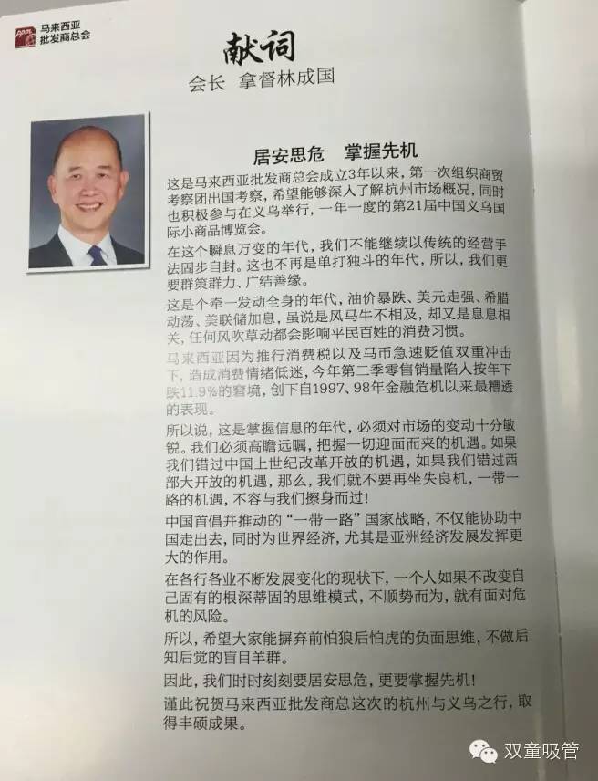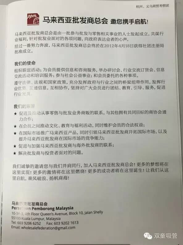 馬來西亞批發(fā)商總會是由一批參與批發(fā)與零售相關(guān)事業(yè)的人士發(fā)起成立的組織,此次來義烏,是該會成立3年以來,第一次組織商貿(mào)考察團(tuán)出國考察,希望能夠深入了解杭州市場概況,同時也積極參與我們義烏的第21屆義博會。
