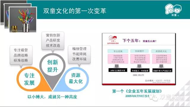 2005年9月13日,“雙童吸管”發(fā)布第一個“五年規(guī)劃”。樓仲平與開發(fā)團隊一起,致力于思考除了喝飲料,吸管還能“干什么”?如何讓吸管“無奇不有”。于是,最近10年來,“雙童吸管”逐漸放棄了低端加工和薄利多銷,專注于高端市場的開發(fā)。憑借細致入微、持續(xù)不斷的產(chǎn)品創(chuàng)新,企業(yè)員工人數(shù)從原來的900名減少到了現(xiàn)在的350名,但員工的平均生產(chǎn)能力增加了數(shù)倍,以“減法”實現(xiàn)了“加法”。