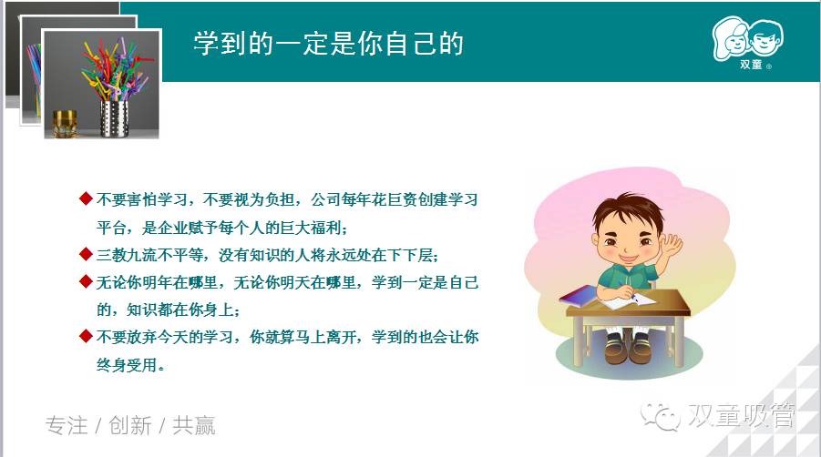 接下來樓總又分享了自己的成長(zhǎng)經(jīng)歷,以自己的親身實(shí)例向大家說明了一句話:只要肯努力,肯學(xué)習(xí),通過不斷地積累和改變,下一個(gè)老板可能就是你呢!同時(shí)也分享了“雙童”核心層的成長(zhǎng)之路,這些從基層做起和雙童一起奮斗了十幾年的伙伴們也在不斷學(xué)習(xí)、不斷進(jìn)取,不斷融入。雙童也因有大家而更精彩!