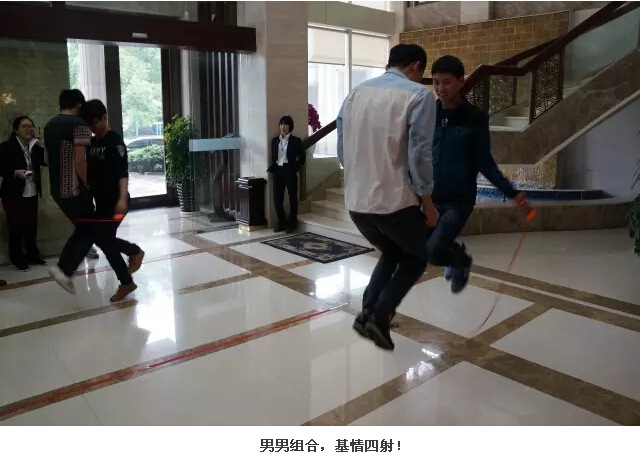 咦!這些小伙怎么個(gè)個(gè)摩拳擦掌呀!原來我們的雙人賽由各個(gè)團(tuán)隊(duì)派出2位男生參賽,背靠背過杠通過賽道,拿到繩子跳足個(gè)數(shù)后回到原點(diǎn)。背靠背過杠?這是什么玩法?妞就放幾張照片讓大家好好瞧瞧!看看大家這架勢(shì),看來男男組合還是蠻靠譜的嘛!