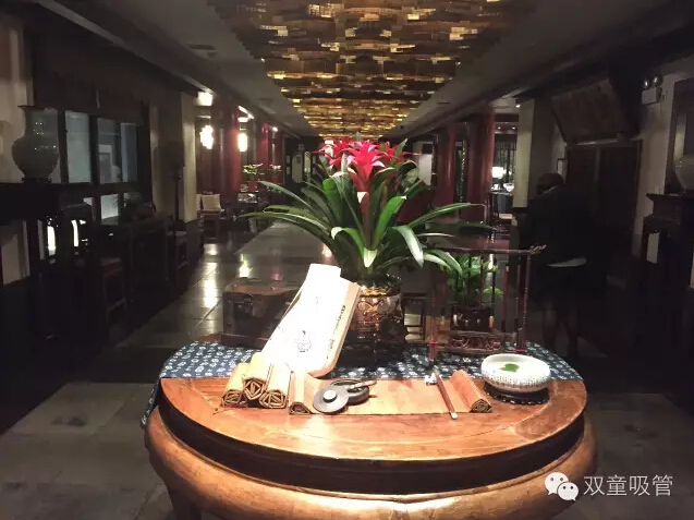 我們?nèi)胱蹑?zhèn)景區(qū)內(nèi)的昭明書舍酒店,酒店大堂的燈都是用書簡裝飾,文房四寶靜靜擺放其中,別有格調(diào)。