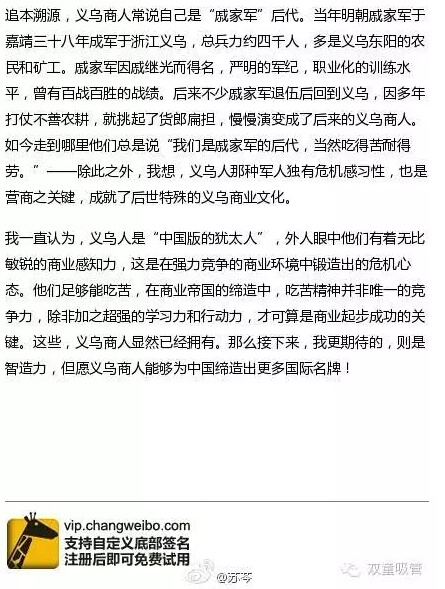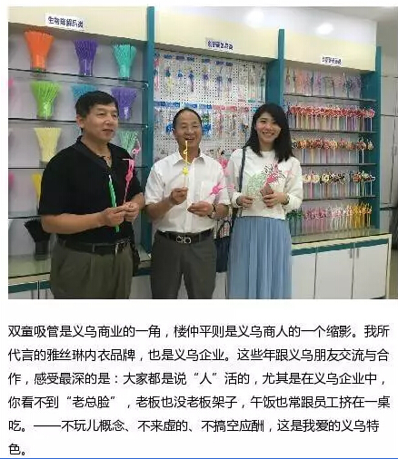 6月2日,“雙童”來了幾位貴客,有微博紅人@傳媒老王 ,也有著名作家蘇芩。當家人樓總向來喜歡交“網(wǎng)友”,見到幾位大咖更是熱情接待。這不,作家蘇芩在回去后,在微博上寫了一篇關于義烏的文章,里面也重點提到了“雙童”的工匠精神和精細化管理呢!下面妞就把這篇文章照搬過來,和大家一起分享!