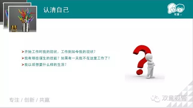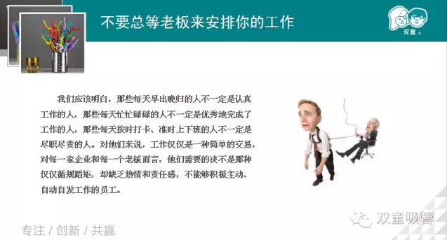 沒有一種工作是錢多,事少,離家近的,我們只有提升自我,做好自己的工作才能獲得最高的回報,那我們到底該怎么做呢?接下來妞就放上幾張PPT和大家共享吧!