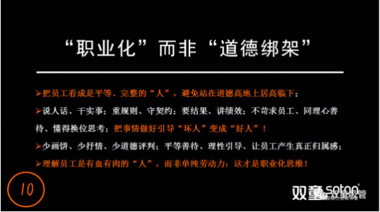 在“理性”思維的持續(xù)引導(dǎo)下,“雙童”在文化中倡導(dǎo)把員工看成是平等、完整的“人”,而非站在道德高地上居高臨下,處處體現(xiàn)尊重、公平和雙贏。我們理解員工是有血有肉的“人”,而非單純的勞動(dòng)力,對(duì)待員工少“畫餅”,少抒情,懂得換位思考,不去“道德綁架”員工,才能讓員工真正產(chǎn)生歸屬感。