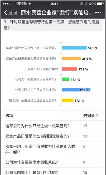 而值得一提的是,麗水市政府已經(jīng)連續(xù)4次組織企業(yè)主來(lái)雙童參觀學(xué)習(xí)啦!他們對(duì)此次的學(xué)習(xí)也非常重視,早在上個(gè)月,就已經(jīng)在內(nèi)部的微信群里宣傳起了雙童,而且還特意針對(duì)這次的參觀設(shè)計(jì)了調(diào)查問卷,足以看出他們的用心之處!