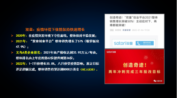 2021年度,“雙童創(chuàng)業(yè)共享平臺(tái)”各創(chuàng)業(yè)體公司板塊,年度銷售額同比增長(zhǎng)57.85%?。?!