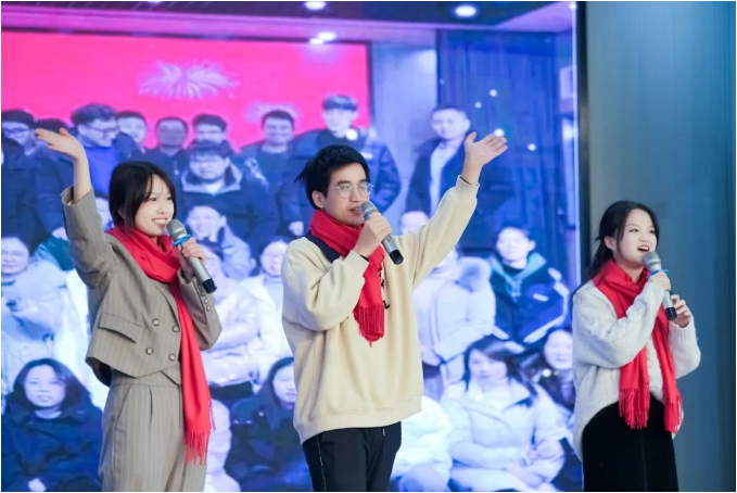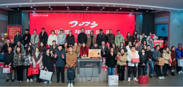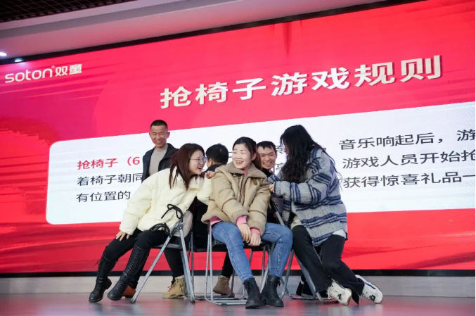 新年祝福視頻過后,現(xiàn)場的喜慶氛圍在一首歌曲表演下達(dá)到了頂峰。由文宣團(tuán)隊(duì)帶來的經(jīng)典歌曲《相親相愛一家人》,這一耳熟能詳?shù)母枨尨蠹叶家黄饟]起手來加入了合唱。伴隨著動人的音樂,背景短片還帶現(xiàn)場所有“雙童人”一起重溫了2022年的溫情瞬間,無論是車間一線生產(chǎn)人員的暖陽般的微笑,還是銷售人員拿著銷冠獎杯的喜悅,都一一呈現(xiàn)?;仡欉@一年,可謂是真正的大豐收!