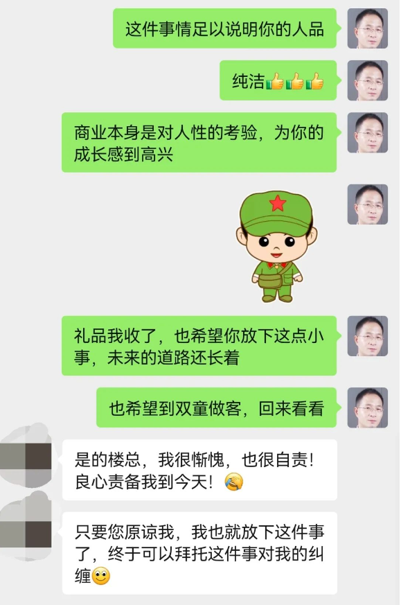 樓仲平當即發(fā)去微信詢問,原來是該員工在崗期間吃了1088元的回扣,此后一直覺得坐立難安。樓仲平在知悉了事情的來龍去脈后,非但沒有不快,反而當即對這位前員工的人品表示了認可,并且大方原諒。在樓仲平的幫助下,這位前員工終于解開了困擾自己已久的心結,與自己達成和解。
