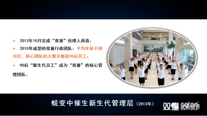 另一方面,新進(jìn)年輕人也能夠得到重用。2013年,“雙童”在完成團(tuán)隊(duì)重組之后,管理團(tuán)隊(duì)平均年齡不到30歲,大部分都是90后,在制造業(yè)企業(yè)來說,是屬于少有的管理年輕化。