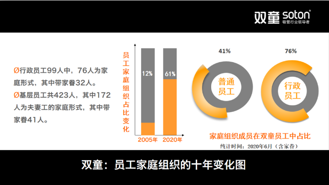 “雙童”在“家文化”推行過程當(dāng)中,讓員工能夠安心地在公司工作、生活、戀愛,形成了濃厚的“家文化”氛圍!直到現(xiàn)在,已經(jīng)有140個(gè)家庭在“雙童”落戶,其中最多的有一家11口人住在公司。其中,有的把父母和孩子接過來一起照料,也有的在“雙童”找到人生伴侶,擁有了幸福的家庭。