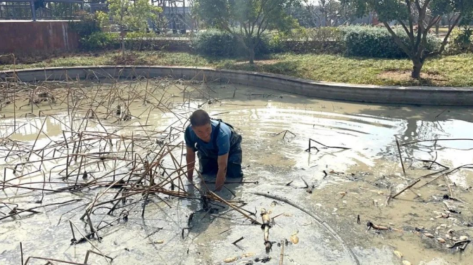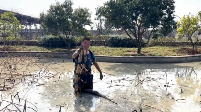 園丁大哥身穿防水服,手拿高壓水槍沖擊淤泥,他彎腰在藕塘里探尋藏在淤泥里的鮮嫩蓮藕,用力一拔,一根一米多長(zhǎng)的藕從淤泥里被拽了出來(lái)。
