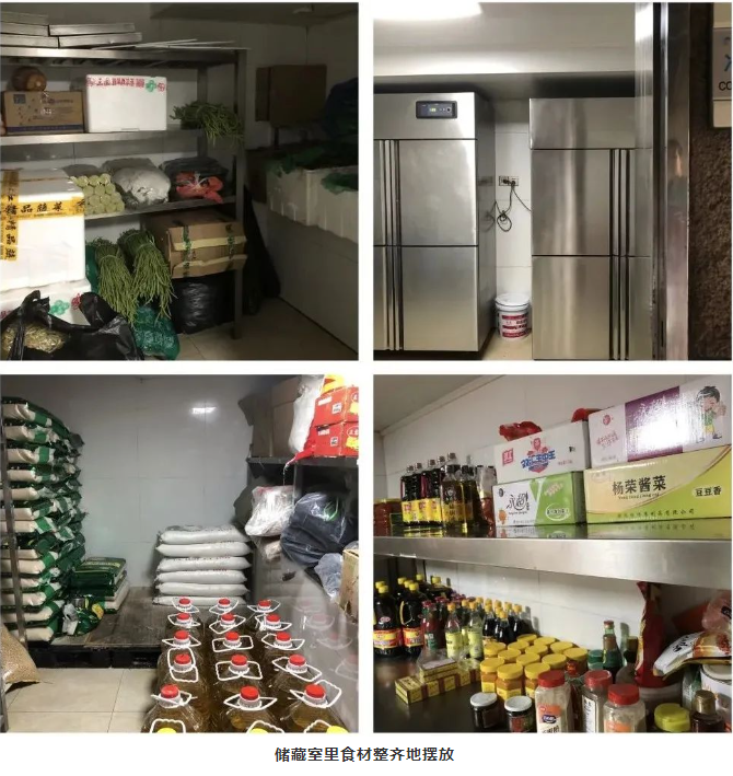 其中采購入庫的魚、肉等易腐爛變質(zhì)的葷菜必須分區(qū)妥善保存在冰箱中,新鮮蔬菜與米、面等主食原料分開存放;除了常規(guī)的食材分開存放外,食用油、大米、面粉、面條、調(diào)味料等食材消耗品,進(jìn)行分類、分架、隔墻、離地存放。