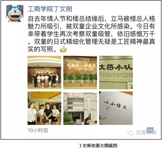 據(jù)丁老師自己介紹,他之前來(lái)過(guò)一次“雙童”,當(dāng)家人樓總帶著他參觀了企業(yè)后,對(duì)我們的精細(xì)化管理深表贊賞,離開(kāi)了之后也一直念念不忘。就連學(xué)生的開(kāi)學(xué)第一天,他就號(hào)召大家關(guān)注“雙童”的官方微信,時(shí)刻關(guān)注我們的動(dòng)態(tài)向我們學(xué)習(xí)。(吸管妞肺腑之言:這樣的班主任,請(qǐng)給我來(lái)一打?。?/span>