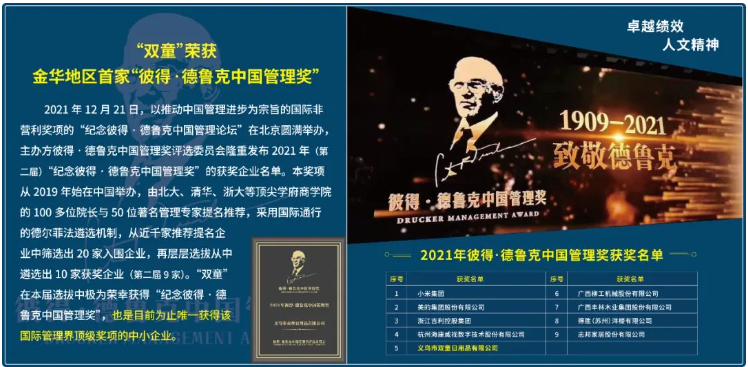 2021年12月21日,“雙童”榮獲金華地區(qū)首家“彼得·德魯克中國管理獎”。本獎項是由北大、清華、浙大等頂尖學府商學院的100多位院長與50位著名管理專家提名推薦,從近千家推薦提名企業(yè)中層層選拔從中遴選出10家獲獎企業(yè)?!半p童”是目前為止唯一獲得該國際管理界頂級獎項的中小企業(yè)。