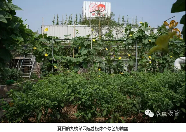 “雙童”的屋頂菜園有700多平方米,上下錯落,分為四層,如同一個精致的梯田,到了夏日,濃蔭密布整個九樓菜園,遠看極像一個綠色的城堡。
