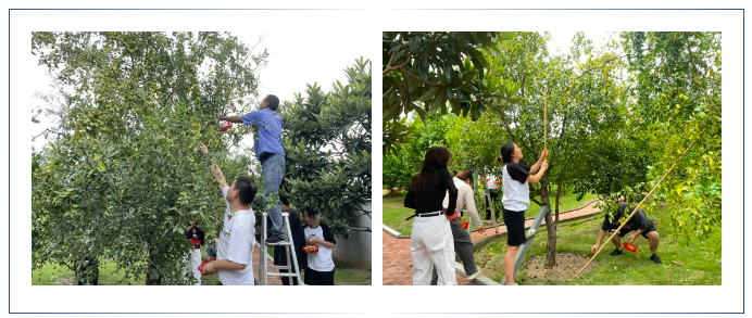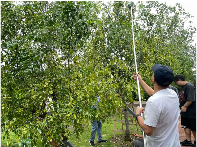 用手搖、用竹竿敲、爬梯子摘、在樹下?lián)炻?/strong>為了能裝滿自己的小籃子,大家也都沒閑著,“各顯神通”,現(xiàn)場一片“手忙腳亂”!