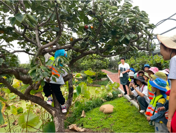 后面講解員帶領(lǐng)小朋友們前往此次游學(xué)的最后一站——“雙童”空中生態(tài)園。在這里,“雙童”講解員輔助幼兒園老師將小朋友們分為三組,然后繪聲繪色地向小朋友們介紹著“花園中”果樹的品種,通過故事性的表達(dá)讓小朋友們更加直觀地了解到其中的差別,也增長了他們的自然知識。