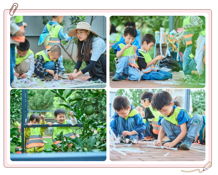 當(dāng)然,幼兒園的老師們也精心準(zhǔn)備了益智游戲——編制吸管網(wǎng)。也就是把吸管作為“網(wǎng)線”,一點一點拼接為一張很大的網(wǎng)??矗∨笥褌冏龅?/span>多么認(rèn)真。