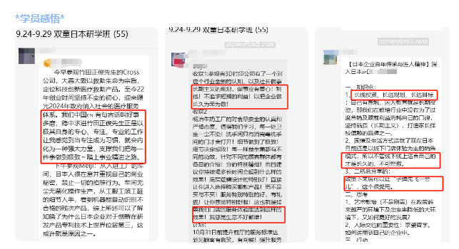 兩期日本企業(yè)游學(xué)之旅,很多學(xué)員都深受啟發(fā),在貫穿研學(xué)全程的巴士課堂上大家暢所欲言,分享所見(jiàn)所得所想。無(wú)論是從巴士課堂上的分享發(fā)言、還是從形成文字感悟來(lái)看,都能看出來(lái)大家收獲滿滿!