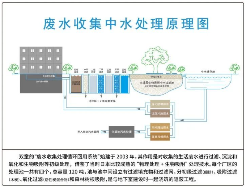 除此之外,“雙童1號樹”的土層下,還建有一個(gè)土壤層生物吸附過濾池,員工們使用后的生活廢水,經(jīng)過過濾后,會匯聚到“ 雙童一號樹”下進(jìn)行生物吸附處理。