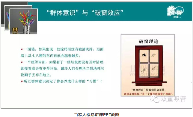 一個(gè)組織內(nèi)部,如果有了一些垃圾而沒有及時(shí)清理,緊接著就會(huì)有更多垃圾,最終人們會(huì)理所當(dāng)然地將垃圾順手丟棄在地上。所以群體意識(shí)決定了你會(huì)養(yǎng)成什么樣的習(xí)慣,而你的習(xí)慣也會(huì)影響著整個(gè)集體。