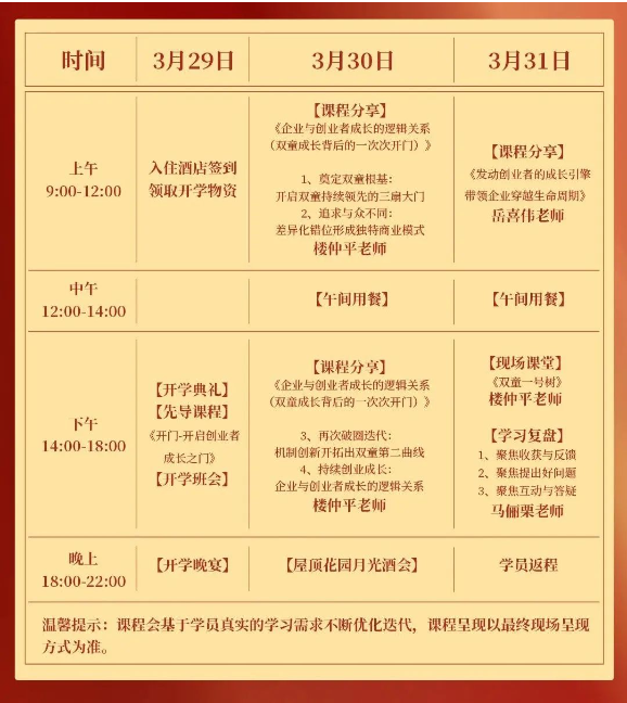 課程交付中,樓仲平老師將分享其成長背后的底層邏輯《企業(yè)與創(chuàng)業(yè)者的邏輯關(guān)系》,岳喜偉老師則帶來《發(fā)動創(chuàng)業(yè)者的成長引擎帶領(lǐng)企業(yè)穿越生命周期》課程分享。