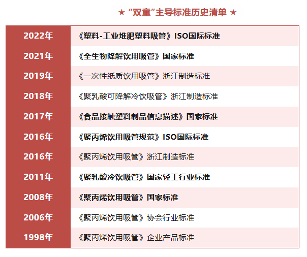截至目前,“雙童”先后承擔(dān)了中國吸管產(chǎn)業(yè)的團體標(biāo)準(zhǔn)、浙江制造標(biāo)準(zhǔn)、輕工行業(yè)標(biāo)準(zhǔn)、國家標(biāo)準(zhǔn)和ISO國際標(biāo)準(zhǔn)等十多項國家級標(biāo)準(zhǔn)的起草和編制工作。
