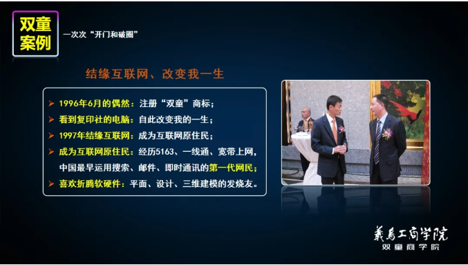 早在1996年注冊“雙童”商標(biāo)時,自己就開始學(xué)習(xí)電腦應(yīng)用,成為中國互聯(lián)網(wǎng)的原住民。并在數(shù)字化工具加持下,為“雙童”率先打開了國際市場,短短幾年時間,超越同行,奠定了成為行業(yè)冠軍的基礎(chǔ)。