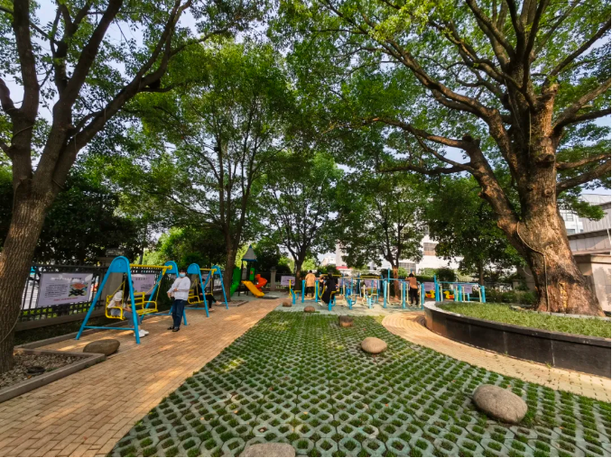 五月份之后,這棵樹的葉子更茂密,樹蔭下這塊地方就成為了我們員工的健身區(qū)。我平時如果來的早的話,有時也會到這里活動,拉個單杠運動一下,特別是周末或者下午下班的時間,這里會聚集很多員工、家屬和小朋友玩耍嬉鬧!