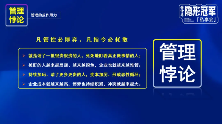 但是根據(jù)管理悖論,“凡管控必博弈,凡指令必耗散”,企業(yè)經(jīng)營真正的危險更多來源于內(nèi)部的耗散;企業(yè)管理真正的成本來源于成員之間的博弈,所以,當企業(yè)有一定規(guī)模之后,則要用治理的“疏”替代管理的“堵”,需要在滿足人性訴求下,對管理的本身進行結(jié)構(gòu)優(yōu)化和激勵。