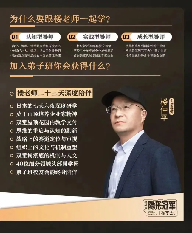 歡迎您走進(jìn)「樓仲平·弟子班」課堂,在樓仲平老師的陪伴下,學(xué)習(xí)借鑒雙童30年的成功的經(jīng)驗(yàn)積累,助力您在創(chuàng)業(yè)路上更加順?biāo)?,在遇到抉擇時能做出更加理性的判斷!
