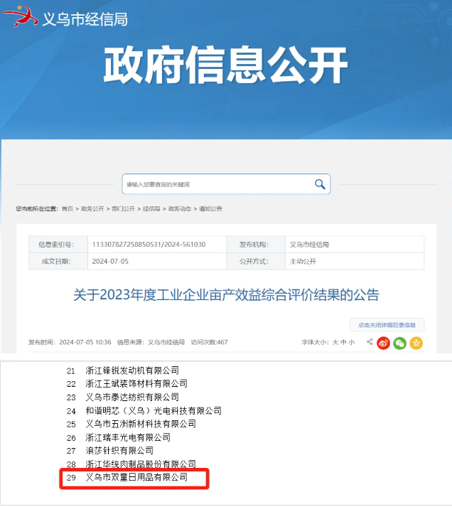 昨日,2023年度義烏工業(yè)企業(yè)畝產(chǎn)效益綜合評(píng)價(jià)結(jié)果正式出爐,“雙童”再次獲評(píng)A類(lèi)企業(yè)!至此,“雙童”已連續(xù)11年榮登畝均效益“英雄榜”!
