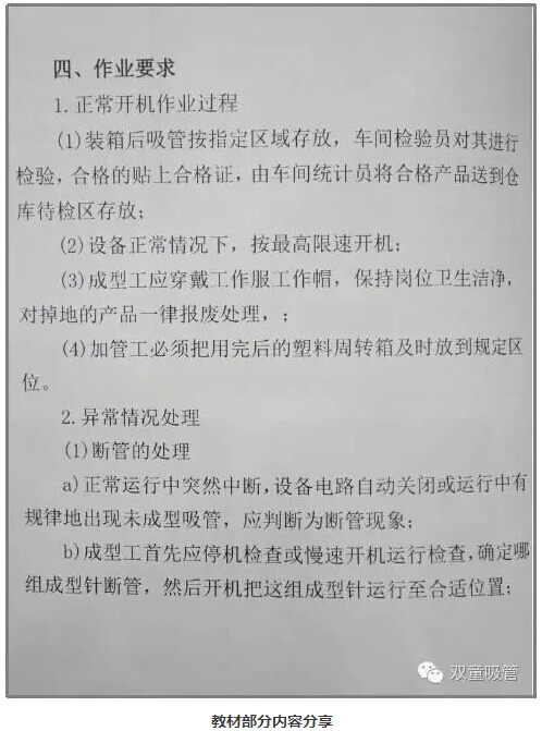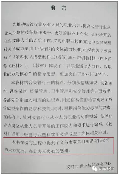 近期,由“雙童”代表行業(yè)編制的義烏市職業(yè)技能培訓教材《吸管成型工培訓教材》正式面世!這本書將作為吸管行業(yè)塑料飲用吸管成型工崗位的培訓教材,以后吸管成型工將可以有國家資質(zhì)認定了,對整個吸管行業(yè)來說都是一次技能與操作上的統(tǒng)一提升。
