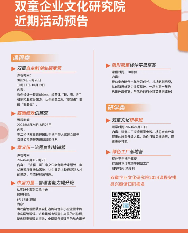 如果你也對“雙童”充滿好奇,也想改變企業(yè)困局現(xiàn)狀,也想要學(xué)習(xí)“專精特新”企業(yè)的管理經(jīng)營方法,歡迎咨詢報(bào)名“雙童”課程!