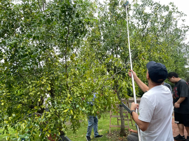 春華秋實。處暑剛過,雙童屋頂花園的一排排棗樹已經(jīng)“踩著點兒”成熟啦!沉甸甸的果實壓彎了棗樹枝頭,可謂“打棗”正當時!