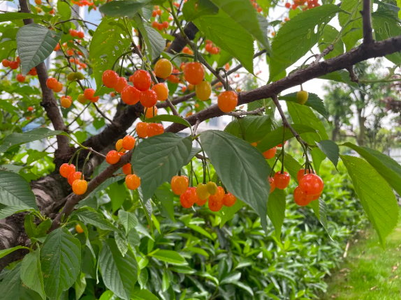 “桃李爭春色滿園,櫻桃初綻笑春寒?!彪p童的櫻桃,像是為了提醒春天來了一樣,每年都是第一個成熟,紅橙相間的櫻桃,藏在綠葉之下,在陽光下更加晶瑩剔透。