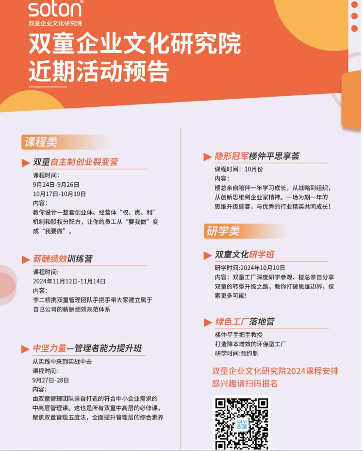 如果你也對“雙童”充滿好奇,也想賦能團(tuán)隊共同成長,歡迎走進(jìn)9月11日【雙童文化研學(xué)班】,與上百位優(yōu)秀的創(chuàng)業(yè)者一起學(xué)習(xí)!少量名額,歡迎咨詢鎖定!