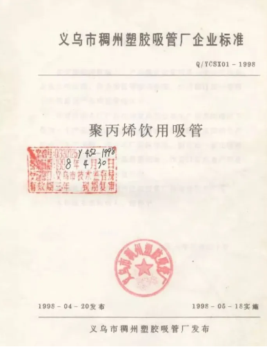 終于在1997年10月,由“雙童”前身的義烏市稠州塑膠吸管廠起草的《聚丙烯飲用吸管》企業(yè)標(biāo)準(zhǔn)順利通過(guò)審核,于1998年4月正式發(fā)布,成為吸管行業(yè)最早的產(chǎn)品標(biāo)準(zhǔn)。從此,“雙童”打開了產(chǎn)品在商超場(chǎng)所的銷售渠道,實(shí)現(xiàn)了傳統(tǒng)家庭作坊企業(yè)向正規(guī)工廠的轉(zhuǎn)型。