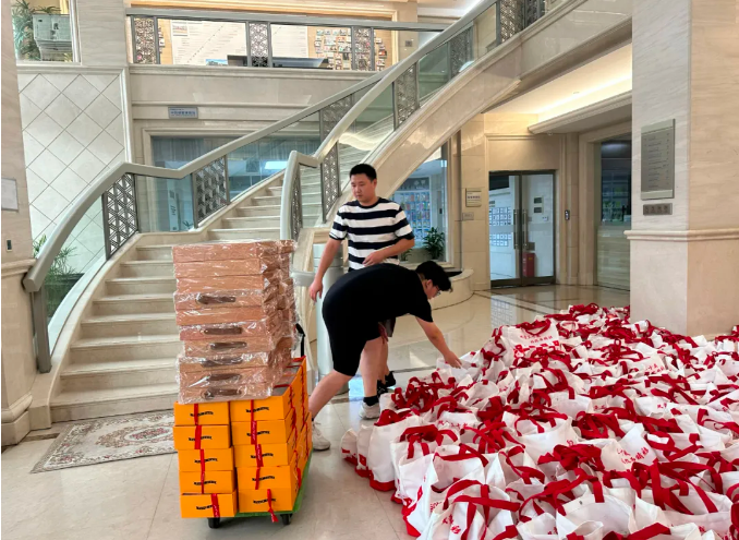 中秋節(jié)雖然還沒有來臨,但后勤部門一早就已經(jīng)開始了熱火朝天的準備工作,將一盒盒精心準備的月餅、水果、吸管禮盒、雙童文創(chuàng)裝入禮品袋中。