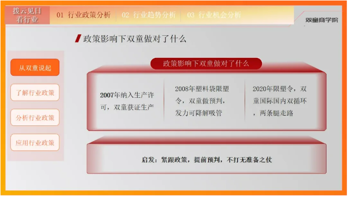 不會分析行業(yè)政策和趨勢的管理者,就如同開車不認(rèn)識路的司機(jī)。在本模塊交付中,李二橋老師向大家詳細(xì)剖析了“雙童”發(fā)展過程中的幾次重大變革轉(zhuǎn)型與行業(yè)政策趨勢的強(qiáng)關(guān)系,提醒學(xué)員作為企業(yè)管理層,要時刻緊跟政策,提前預(yù)判,不打無準(zhǔn)備之仗,并在課程現(xiàn)場也直接給出了行業(yè)政策分析方法、《行業(yè)政策渠道來源集錦》、《行業(yè)趨勢分析表》等操作工具。