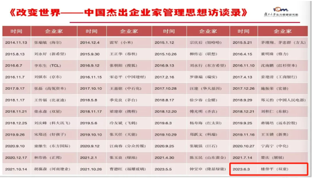 自2014年《改變世界》項(xiàng)目啟動(dòng),上海第一財(cái)經(jīng)頻道還同步推出了同名系列專題片訪談,近10年時(shí)間共采訪了50位中國(guó)各行各業(yè)影響力頗深的企業(yè)家,通過(guò)深度訪談,薈聚中國(guó)式管理的思想精粹,向世界管理論壇傳遞中國(guó)的聲音!