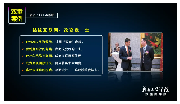 前文所述的雙童先后三次“開門”的經(jīng)歷只是《雙童文化研學班》創(chuàng)始人樓仲平主題課程分享的精彩片段。分享介紹后,樓總還將以問答互動的形式為學員們解答參觀過程中疑惑、或者企業(yè)發(fā)展中遇到的問題,讓大家在研學活動中避免走馬觀花,真正找到“雙童”經(jīng)營過程中的科學管理邏輯,實現(xiàn)創(chuàng)業(yè)思維的升階!