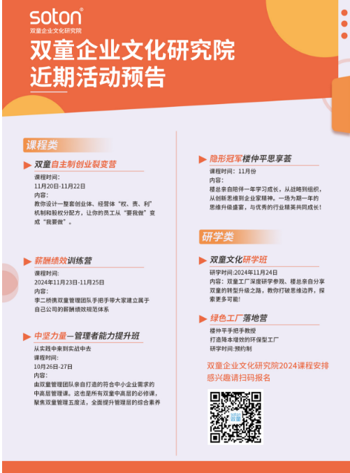 如果你也對“雙童”充滿好奇,也想讓企業(yè)成為行業(yè)的領導者,歡迎走進11月24日【雙童文化研學班】,與上百位優(yōu)秀的創(chuàng)業(yè)者一起學習!少量名額,歡迎咨詢鎖定!