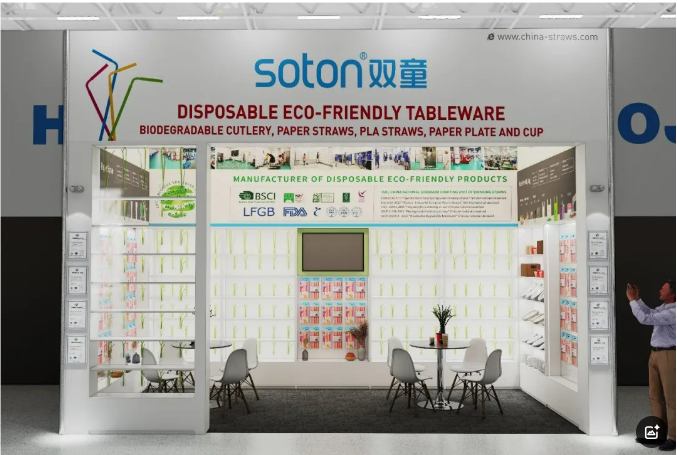 雙童日用品本次參展以推廣可降解產(chǎn)品為主:PLA吸管、紙吸管、可降解膜袋類(lèi)、創(chuàng)新吸管、塑料口杯、PE手套、垃圾袋、塑料吸管、不銹鋼吸管、玻璃吸管、竹子吸管等。