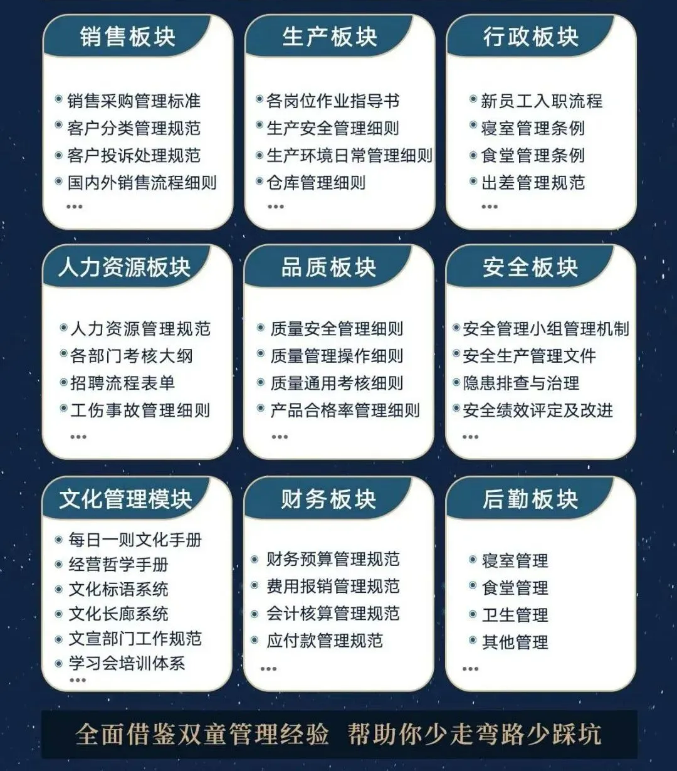 所以,入學(xué)“隱形冠軍樓仲平思享薈”之后,項(xiàng)目組會(huì)將“雙童”積累了30年、包含了銷(xiāo)售、生產(chǎn)、行政、人類(lèi)資源、品質(zhì)、安全、文化管理、財(cái)務(wù)和后勤等9大板塊,600份管理規(guī)范文件,全部打包給學(xué)員,幫助學(xué)員企業(yè)能夠全面借鑒雙童管理經(jīng)驗(yàn)、少走彎路、少踩坑!